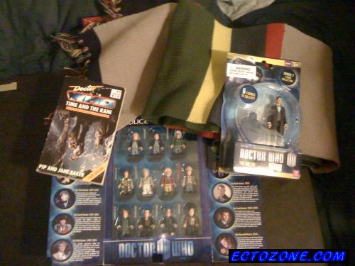 Very good year for the Doctor, which since it's the fiftieth anniversary is appropriate. In addition to the scarf, an old Target Books novelization I needed (I tried to get all the regeneration stories) and a couple of toys: a 3.75 inch action figure of the Eleventh Doctor (it'll go well with my Star Wars guys and some others I have) and a Minimate-esque set of all the Doctors (well, for another four months, anyway). Unfortunately, they're just a little smaller than the Ghostbusters Minimates, so the planned Egon Spengler/Ian Epimetheus reunion looks a little wierd: