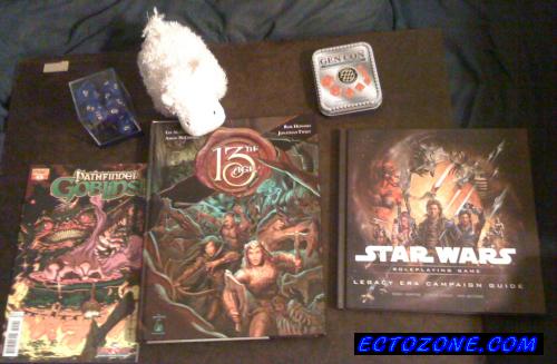 The rest include the GenCon 2013 official dice set and a set of large size dice from Crystal Caste; a Cataan sheep from Mayfair Games (because of a number of boring injokes); Pathfinder: Goblins#1 signed by the cover artist, the aforementioned Andrew Huerta; and the Legacy Era Campaign Guide for Star Wars Saga Edition. I have little use for most of the EU crap after Episode 6, and always said "Legacy Era will be just about the last SWSE book I ever buy". Well, it very nearly literally was--all I need is The Unknown Regions to have a complete SWSE set.