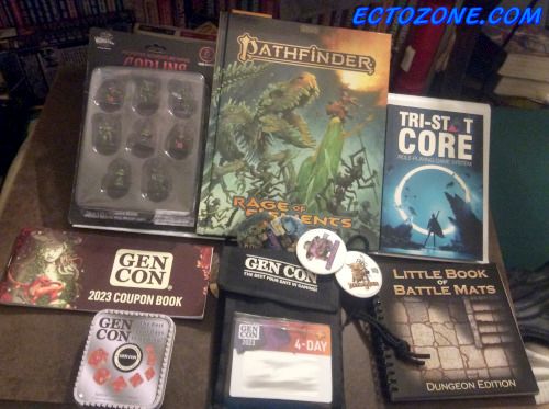 The newest Pathfinder book was really my only "big" purchase. The rest of it was either freebie or cheap; you also see my badge and the 2023 coupon book (I don't get hard copies of the program guides anymore, because the PDF copy doesn't take up nearly as much space.)