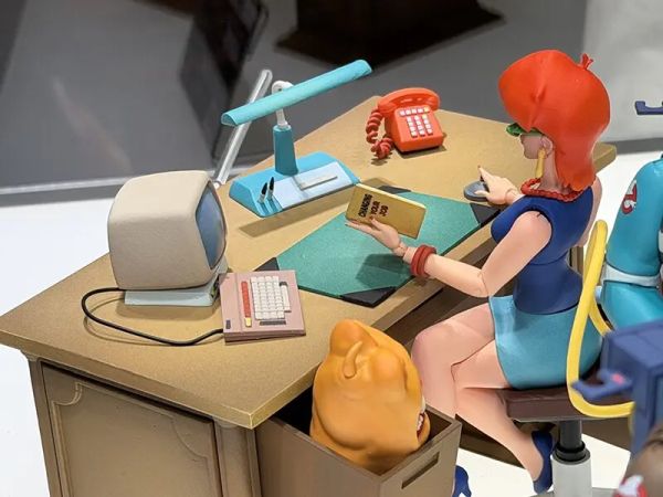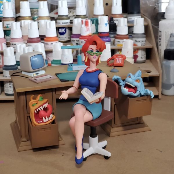 Skipping her occasional ghostbusting gear, this version of Janine sticks to her signature receptionist attire from the animated series. Staying true to her on-screen personality, the figure includes a wide assortment of accessories that any sassy, no-nonsense receptionist would need. Included are a haunted desk setup, an office chair (with swappable lower torso for a seamless cross-legged pose), alternate heads and hands, and an exclusive Slimer designed to attach to Janine and appear mid-kiss, serving as a callback to the cartoon’s original intro sequence.
