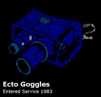 The Ecto-Goggles, resembling Spook Eyes in appearance are one of the smallest but equally effective pieces of equipment. Essentially a wearable P.K.E. Meter, the goggles slip over the wearer's eyes, allowing them to be able to track an entity while also being able to study its readings. The Ecto-Goggles also prove useful in locating invisible entities. As the goggles can locate P.K.E. they can create a virtual image of the entity. The Ecto-Goggles have seen several incarnations, most notably the original design, and then a unusual design created by Dr. Egon Spengler to help locate several poltergeists who had the ability to become invisible. Polarised lenses that could detect P.K.E detected them.