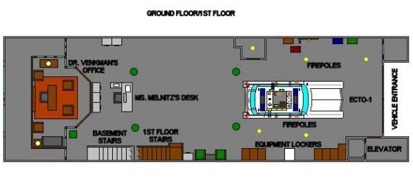 While originally described as a layout discrepency, recently take photos have revealed that the layout of the Firehouse is a lot more complex then originally thought, as illustrated by the revised set of floorplans. The ground floor is pretty much as theorized, the only note to make is that the large green pillars appear to be set pieces, they don't exist in the photos of the LA Firehouse and have a different design in Ghostbusters 2.