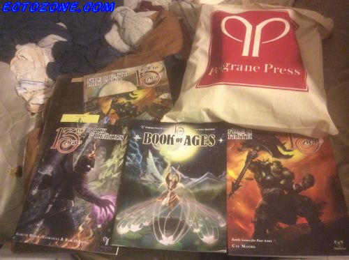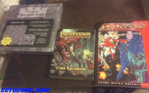 R. Talsorian reprinted their mecha game Mekton Zeta; Ogre and I got that book when it was originally printed in the 1990's, but it seems to have vanished over the years. Now we have a fresh new copy. Leave it to me to finally pick up the Pathfinder core book when the second edition is now playtesting. The dungeon tiles will be neat if/when Ogre and I can get a game up and going again. Darn all our players for having real lives and stuff.