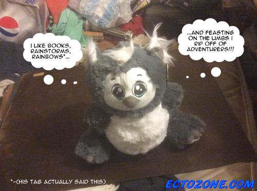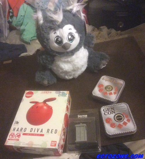 The stuffed owlbear seen above along with the GenCon commemorative dice sets, a miniature TARDIS from Gale Force Nine, and a red Haro from the Gundam franchise.